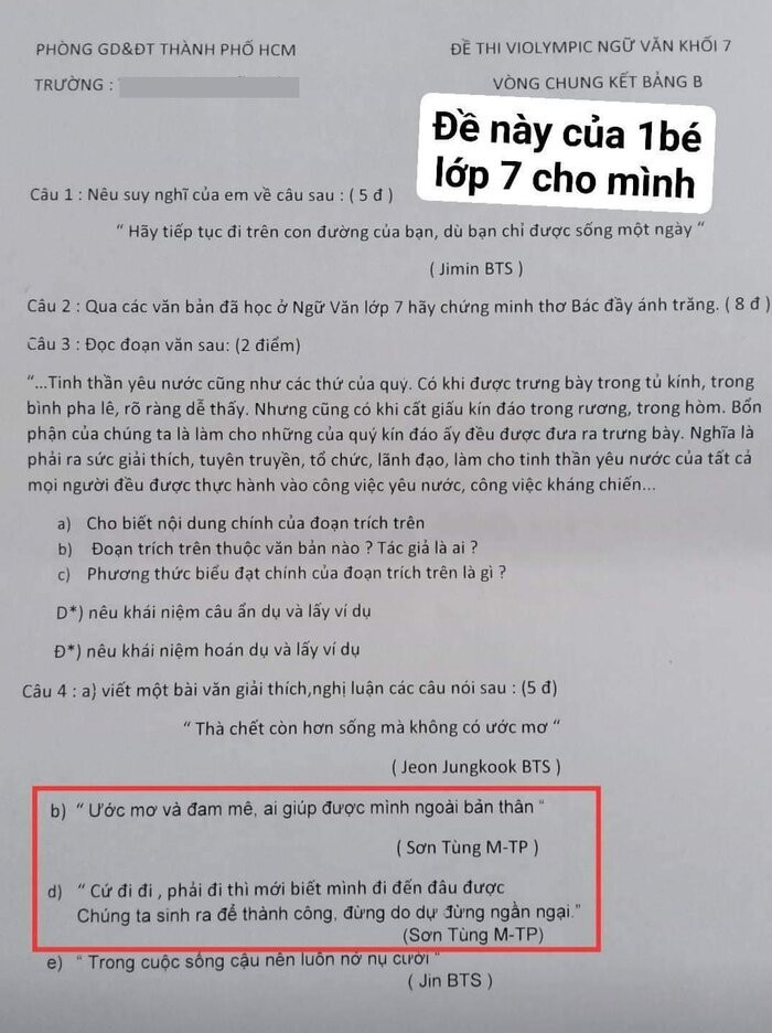 Trước đó cộng đồng mạng cũng đã được một phen trầm trồ khi cái tên đình đám trong làng nhạc Việt hiện nay là Sơn Tùng M-TP và nhóm nhạc Hàn Quốc được yêu thích nhất - BTS bỗng bất ngờ xuất hiện trong đề thi Ngữ Văn của một trường THCS.