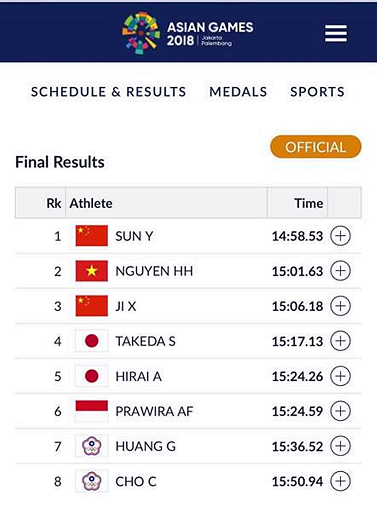 Làng thể thao Việt Nam đã dậy sóng với Nguyễn Huy Hoàng, chàng trai 18 tuổi đã suýt chút nữa vượt qua kỷ lục gia Sun Yang của Trung Quốc để giành HCV ở nội dung 1.500m tự do. Thế nhưng, tấm HCB đã là kỳ tích lịch sử của bơi Việt Nam ở sân chơi ASIAD.