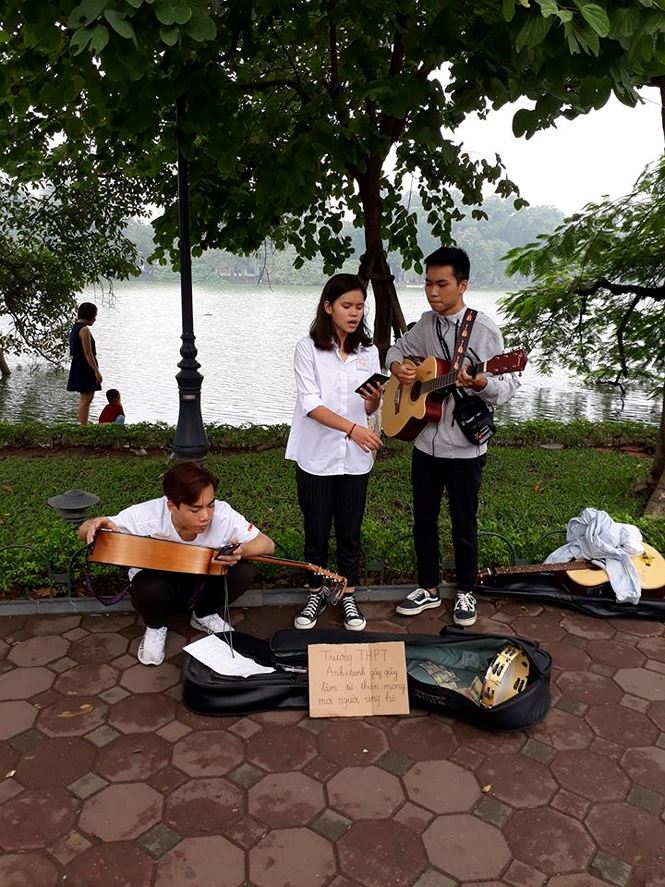 Các bạn học sinh lên Bờ Hồ kiếm tiền gây quỹ mua chăn ấm.