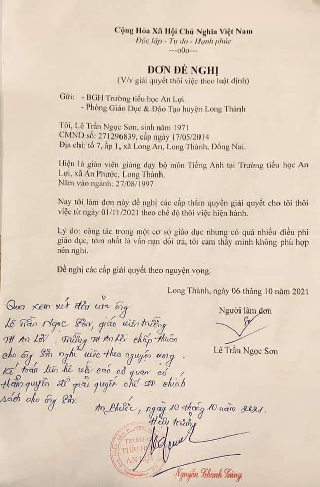 “Qua xem xét đơn của ông Lê Trần Ngọc Sơn, giáo viên Trường Tiểu học An Lợi; Trường Tiểu học An Lợi chấp thuận cho ông Sơn nghỉ việc theo nguyện vọng. Kế toán liên hệ với các cơ quan có thẩm quyền để giải quyết chế độ chính sách cho ông Sơn”, nội dung bút phê trong đơn.