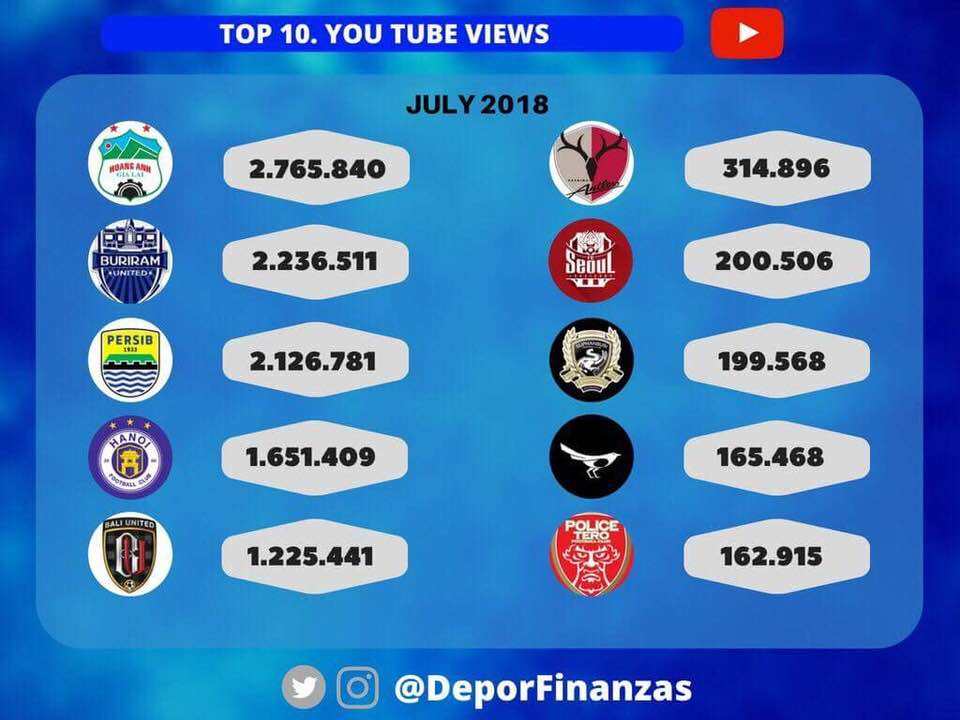 Cụ thể, HAGL tăng hơn 700 nghìn lượt xem trên Youtube so với tháng 6, từ hơn 2 triệu lượt xem lên gần 2,8 triệu lượt xem. Qua đó, HAGL vượt CLB Thái Lan - CLB Buriram để lần đầu lên đỉnh bảng xếp hạng, một chiến thắng ngoạn mục của đội bóng phố Núi khi duy trì được sự tăng trưởng lượng người xem trong mấy tháng qua, còn các đối thủ bị giảm dần vì các lý do khác nhau.