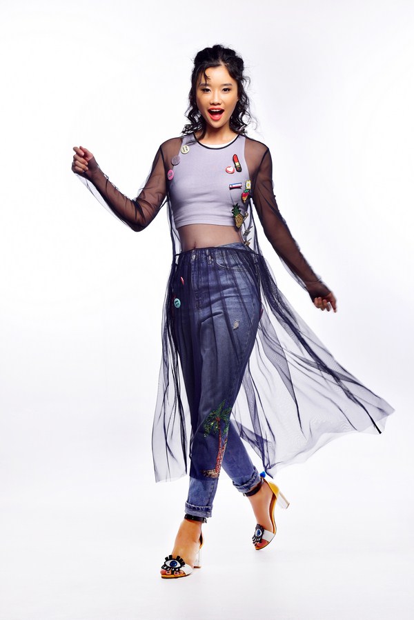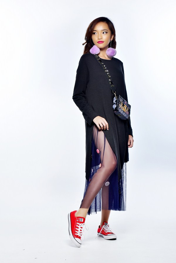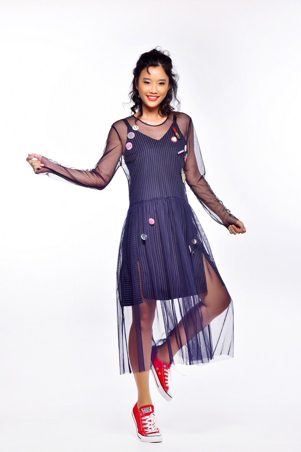 Chiếc đầm yếm dungaree mang đến vẻ tinh nghịch đáng yêu nhưng khi được phủ lớp sheer đính dáng lại cực kỳ cá tính. Nếu có thêm một đôi giày phá cách, màu sắc nổi bật kèm thiết kế độc đáo nữa thì bạn đạt tròn 10 điểm cho cả bộ.