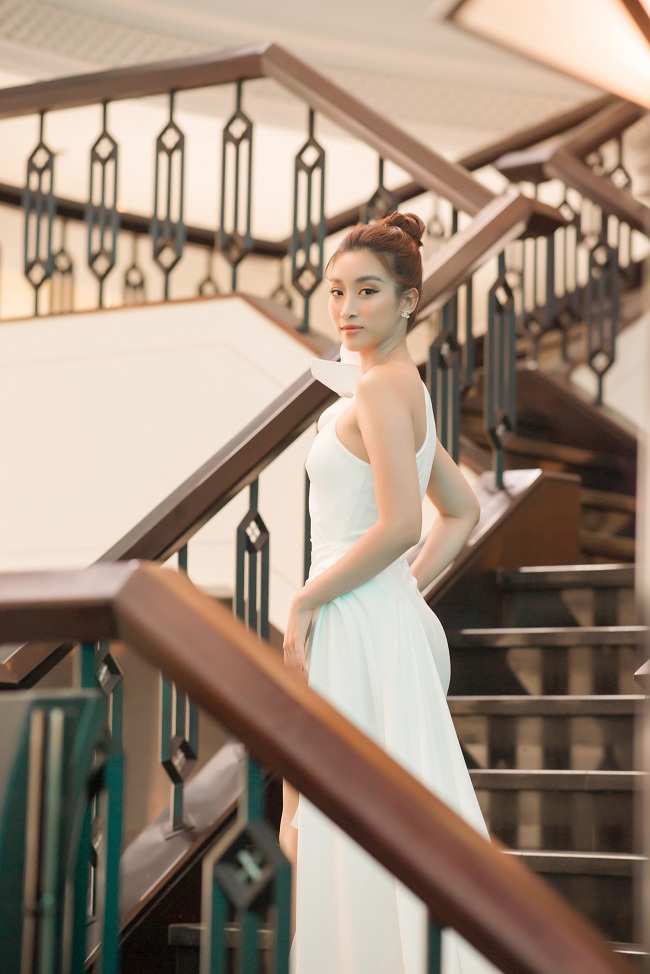Xuất hiện tại sự kiện, Đỗ Mỹ Linh đã lựa chọn khoác lên mình chiếc đầm trắng của NTK Lê Thanh Hòa với thiết kế tinh tế khoe vai trần gợi cảm và xẻ đùi đầy khéo léo.