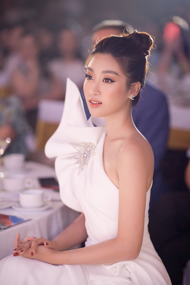 Hoa hậu Đỗ Mỹ Linh đã lựa chọn khoác lên mình chiếc đầm trắng tinh khôi với thiết kế tinh tế khoe vai trần gợi cảm và xẻ đùi đầy khéo léo mix cùng giày cao gót mũi nhọn màu be tại sự kiện vừa qua