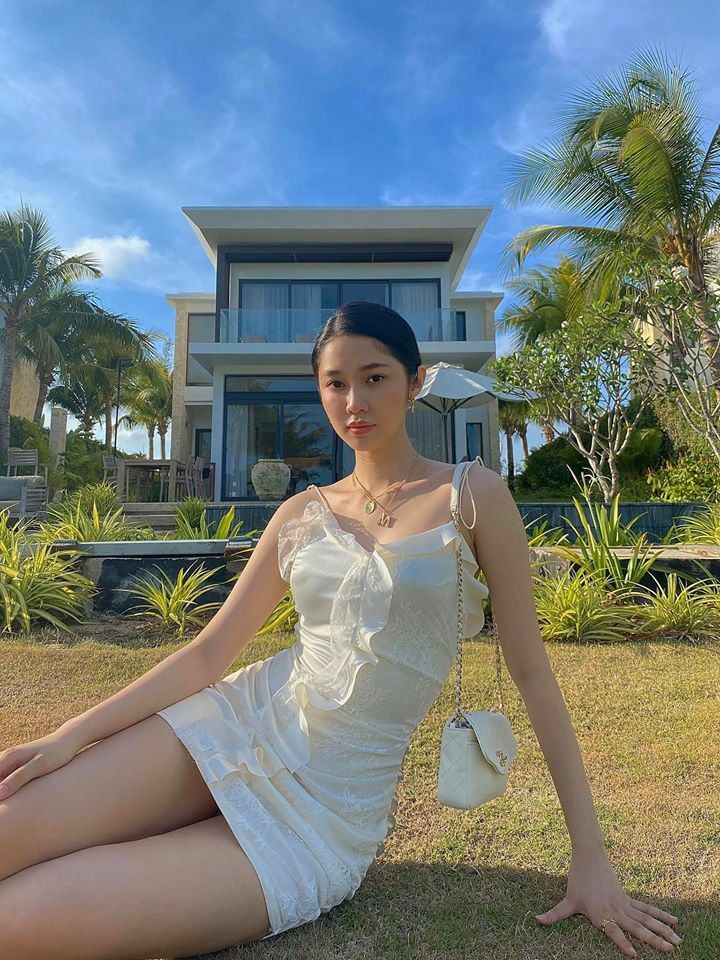Quỳnh Hương chọn cho mình hình ảnh nhẹ nhàng, nữ tính với váy trắng kèm túi đeo vai cùng tông.