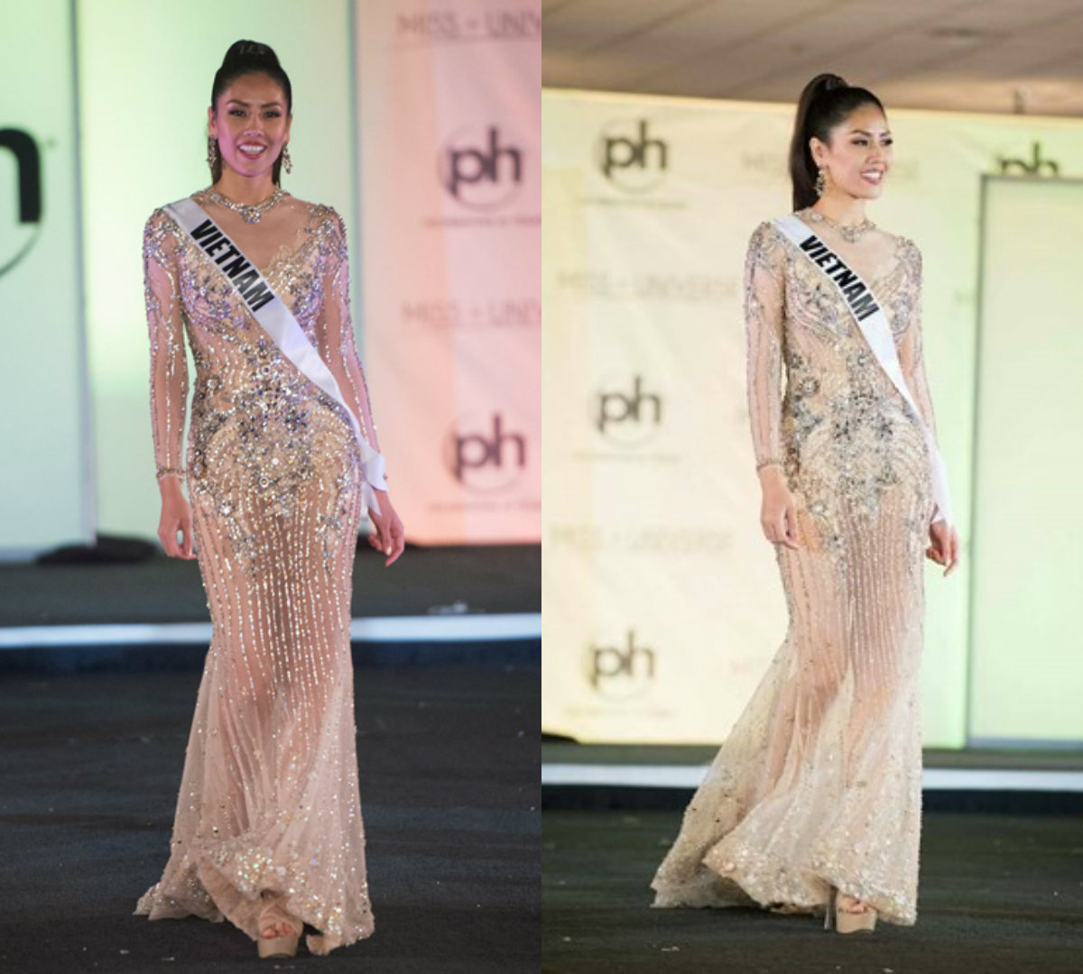 Hình ảnh Nguyễn Thị Loan khoe sắc rực rỡ trên sân khấu Miss Universe trong thiết kế của Đỗ Long. Có lẽ vì bộ cánh quá thu hút nên sau đó được các người đẹp thay phiên nhau xúng xính ăn diện.