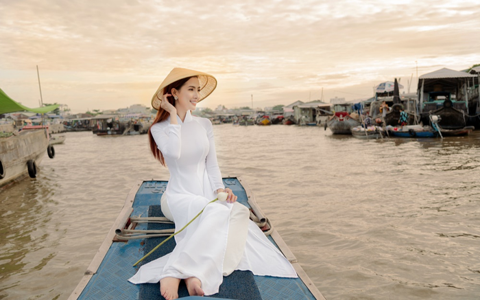 Ngay khi đặt chân đến thành phố Cần Thơ, Mơ Phan đã có buổi trải nghiệm chợ nước nổi Cái Răng – một địa điểm giao thương và du lịch nổi tiếng nhất nhì Tây Đô. Để ghi lại hành trình khám phá đầy thú vị này Mơ Phan đã thực hiện bộ ảnh dung dị cùng áo dài trắng.