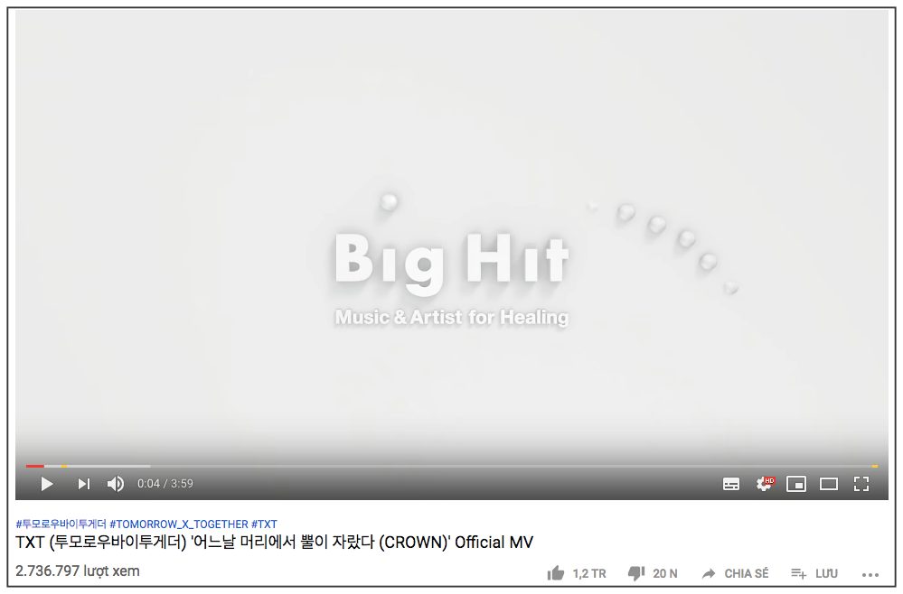 Sau thời gian dài chờ đợi, chiều ngày 4/3, người hâm mộ vỡ oà khi tân binh TXT đã chính thức chào sân Kpop bằng album The Dream Chapter: Star cùng MV đầy tươi sáng CROWN. Là một trong những nhóm nhạc đang được công chúng vô cùng quan tâm, không cần nói cũng biết, TXT đã nhanh chóng gây bão thị trường âm nhạc như thế nào. Chỉ sau vài giờ lên sóng, MV CROWN đã xuất sắc dẫn đầu no.1 iTUNE trên 20 quốc gia và vùng lãnh thổ bao gồm: Hong Kong, Ấn Độ, Philippin, Thái Lan, Insdonesia, Mexico,…. Hiện tại, MV của nhóm đã đạt hơn 2,7 triệu lượt xem sau 3 giờ lên sóng YouTube cùng 1,2 triệu lượt thích.