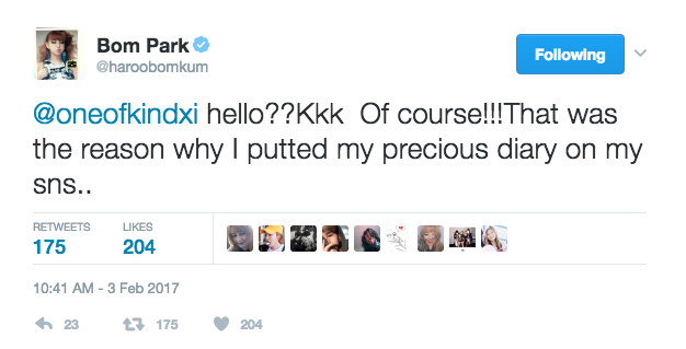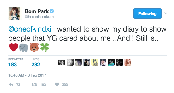 Cụ thể, khi có fan hỏi rằng: “YG có phải vị chủ tịch tốt không?’’, cựu thành viên 2NE1 không ngần ngại trả lời: ‘’Xin chào?? Tất nhiên là có rồi!! Đó chính là lý do mình giãi bày tâm tư hàng ngày trên mạng xã hội…’’, ‘’Mình muốn trải lòng hàng ngày để mọi người thấy được rằng YG quan tâm đến mình.. Và! Vẫn luôn là vậy…”