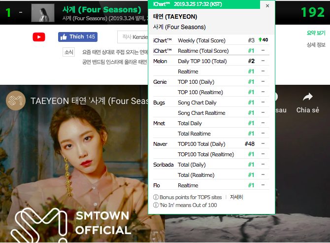 Chỉ sau ít giờ phát hành single, Four Seasons của Taeyeon nhanh chóng giành được realtime all-kill khi #1 trên tất cả các bảng xếp hạng thời gian thực của các trang nghe nhạc trực tuyến. Đây là điều mà 2 đối thủ đến từ YG và JYP là Park Bom và Sunmi chưa làm được. Vậy là trong “trận chiến Big3 tháng 3”, Taeyeon đã giành được chiến thắng đầu tiên. Còn kết quả chung cuộc của “cuộc chiến này” theo bạn là ai? Hãy để thời gian trả lời nhé!