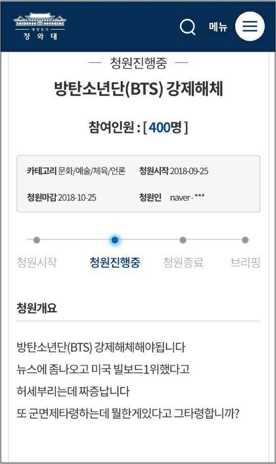 400 người kí tên kiến nghị chính phủ Hàn giải tán BTS.