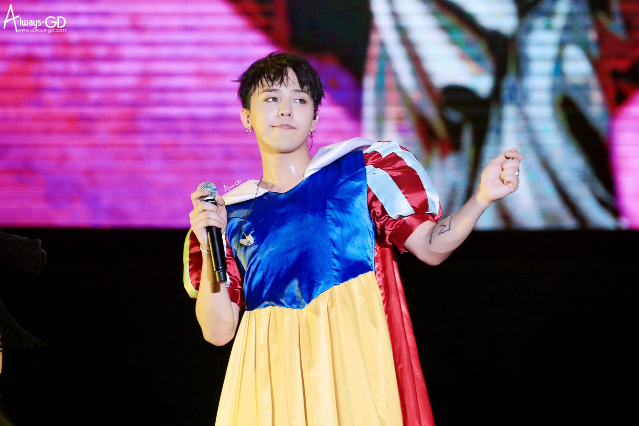 Giả gái vốn là một trò vui khá phổ biến mà những nhóm nhạc nam Hàn Quốc dành tặng cho người hâm mộ trong các concert. Sở hữu gương mặt trung tính không mấy góc cạnh, GD chính là thành viên giả gái đỉnh nhất và thường xuyên được giao trọng trách đó trong BigBang. Thế nhưng mặt khác, chẳng phải vì khoác trên mình bộ váy công chúa rườm rà hay vòng hoa nữ tính trên đầu mà anh chàng thôi quẩy tưng bừng trên sân khấu.