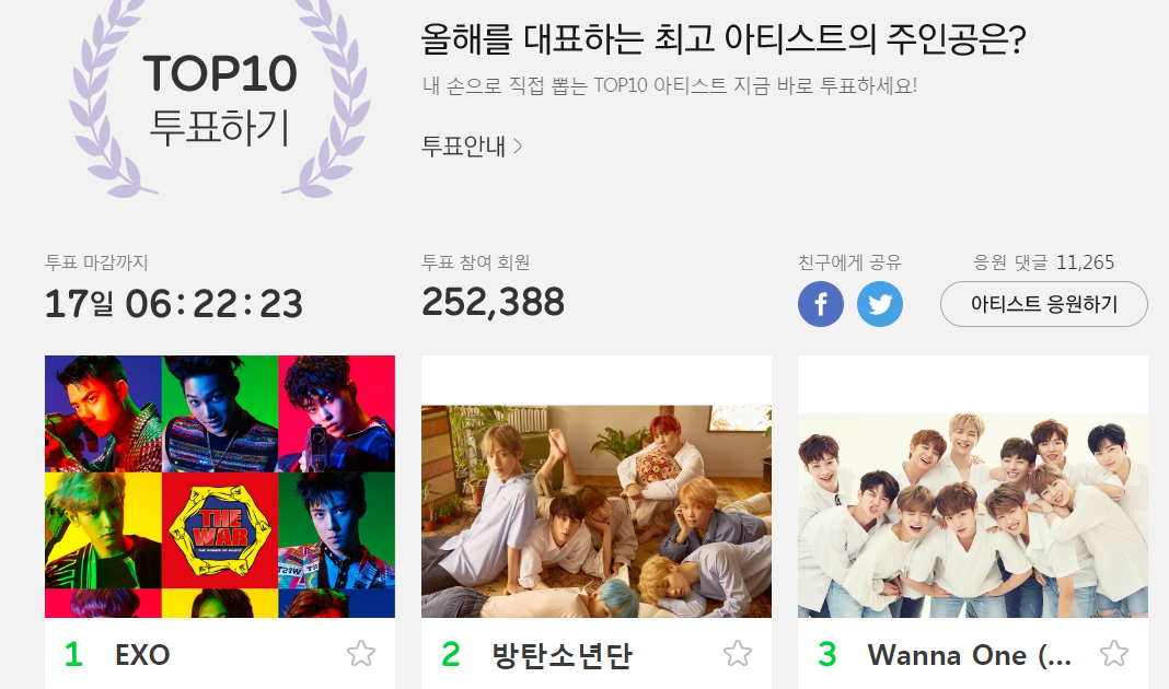 Chậm hơn 1 tuần so với MAMA (Mnet Asian Music Awards), ngày 26/10, Melon Music Awards 2017 vừa chính thức mở cổng bình chọn và công bố danh sách 40 nghệ sĩ có mặt trong vòng tranh giải đầu tiên. Theo đó, vòng 1 sẽ chọn ra top 10 gương mặt Kpop xuất sắc nhất tương ứng với các đề cử Top Artist, Top Album, Top Song, Rookie of the Year,…