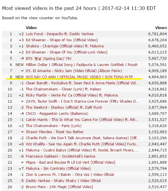 Theo số liệu của Kworb.net, tính đến 11h30 theo giờ EDT tức 22h30 giờ Việt Nam, Nơi này có anh đạt hơn 4.8 triệu lượt xem và đứng thứ 8 trong top những MV được xem nhiều nhất thế giới ngày 14/2.