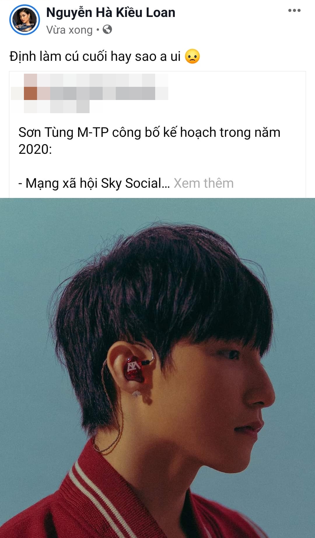 Vốn là ca sĩ có sức ảnh hưởng tại Vpop, những chia sẻ mới nhất từ Sơn Tùng M-TP đã nhận về sự quan tâm từ các đồng nghiệp. Mới đây, Á hậu Kiều Loan đã chia sẻ trên trang cá nhân của mình hình ảnh cũng như kế hoạch của Sơn Tùng M-TP kèm dòng caption: “Định làm cú cuối hay sao anh ơi?”.