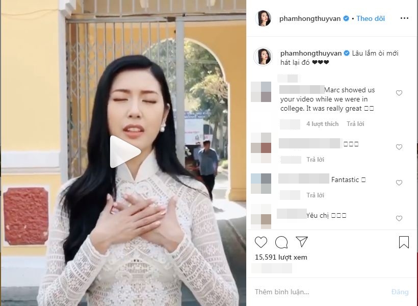 Sau khi đạt được danh hiệu Á quân tại cuộc thi Miss Universe Vietnam 2019, Phạm Hồng Thúy Vân hiện đang là một trong những nhan sắc nhiều người quan tâm. Không chỉ ghi điểm nhờ nhan sắc, trí thông minh mà cô nàng này còn khiến khán giả trầm trồ khi sở hữu giọng hát ngọt ngào. Mới đây, Thúy Vân đã chia sẻ lên trang Instagram của mình một đoạn clip ghi lại cảnh cô nàng say sưa thể hiện My Vietnam - Ca khúc từng được trình diễn tại cuộc thi Miss Vietnam International 2015.