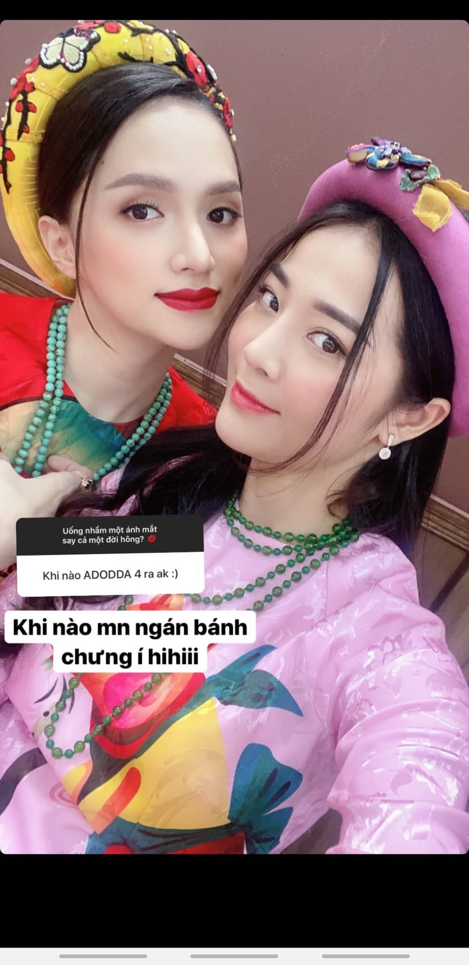 Tuy nhiên đáng nói hơn chính là việc bức ảnh mà Karen Nguyễn đính kèm cùng với câu trả lời của mình mới là điều đáng quan tâm. Hương Giang và Karen Nguyễn cùng nhau xuất hiện trong những bộ quần áo thời xưa, đi kèm là những món đồ trang sức đậm chất cổ điển. Phải chăng đây chính là hint báo trước cho việc Hương Giang và Hân “tiểu tam” sẽ có một màn xuyên không về quá khứ trong phần cuối của #ADODDA. Để lý giải cho tình tiết xuyên không, có lẽ lý do hợp lý nhất chính là việc giải mã cho những thâm thù tiền kiếp từ hai cô gái này?