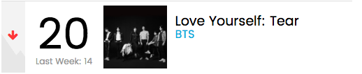 Mới đây nhất, cộng đồng Army (fandom BTS) vui mừng đón nhận thông tin MV Fake Love cùng album vẫn trụ vững trên 2 BXH ở Billboard Hoa Kỳ sau 4 tuần liên tiếp. Cụ thể, album Love Yourself 轉 - Tear hiện xếp thứ 20 trên BXH Billboard 200 và Fake Love về thứ 71 ở BXH Billboard Hot 100 (tính trong tuần kết thúc ngày 23/6).