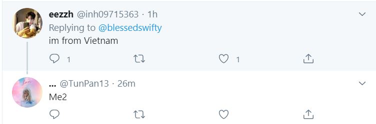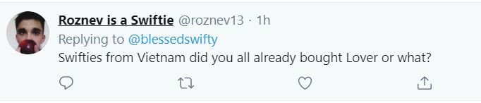 Không thể khác hơn, hiện tượng “khó hiểu” trên đã ngay lập tức thu hút sự chú ý không chỉ từ các fan Việt mà kể cả fan quốc tế cũng vô cùng phấn khích đối với động thái này. Nhiều ý kiến cho rằng cộng đồng Swifties Việt Nam đã âm thầm tổ chức một bữa tiệc stream cho “đứa con tinh thần” thứ 6 của nữ nghệ sĩ và chính điều này cũng dẫn đến màn “hồi sinh” bất ngờ của reputation trên BXH Itunes Việt Nam. Song, các fan quốc tế cũng bình luận kêu gọi rằng “sẵn tiện” hãy cho Lover “hưởng xoáy” để cùng đạt các vị trí top trên BXH.