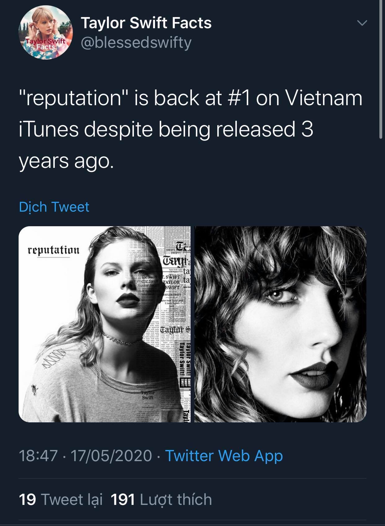 Và mới gần đây, thị trường âm nhạc Việt Nam “đang yên đang lành” thì bỗng nhiên gặp phải một “biến động” đến từ một album kinh điển của nàng Swift. Cụ thể, giữa vô số các tác phẩm hiện tại đang “làm mưa làm gió” tại thị trường Itunes Việt Nam như MAP OF THE SOUL: 7 - BTS, Hoàng - Hoàng Thùy Linh, The Nocturne - NU'EST, thì reputation - album được ra mắt vào năm 2017, đã bất ngờ trỗi dậy và đặt chân tại vị trí No.1 của BXH Itunes Việt Nam. Không thể khác hơn, hiện tượng “khó hiểu” này ngay lập tức đã thu hút khá nhiều sự chú ý của các Swifties Việt Nam lẫn quốc tế.