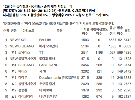Ngày 2/1, phía đài KBS vừa gửi thông báo về kết quả BXH tuần cuối cùng tháng 12/2016 trên Music Bank. Như đã biết, chương trình âm nhạc hàng tuần cuối năm này đã không ghi hình để thay thế bằng đại nhạc hội KBS Song Festival. Tuy nhiên, kết quả dựa trên tiêu chí bình chọn và lượng sản phẩm bán ra từ các sản phẩm thì vẫn được tính. Và ở tuần cuối cùng năm 2016, For Life (EXO) đã chiến thắng FXXK IT (BigBang). Đây cũng là chiếc cúp đầu tiên dành cho sản phẩm này của các chàng trai nhà SM.