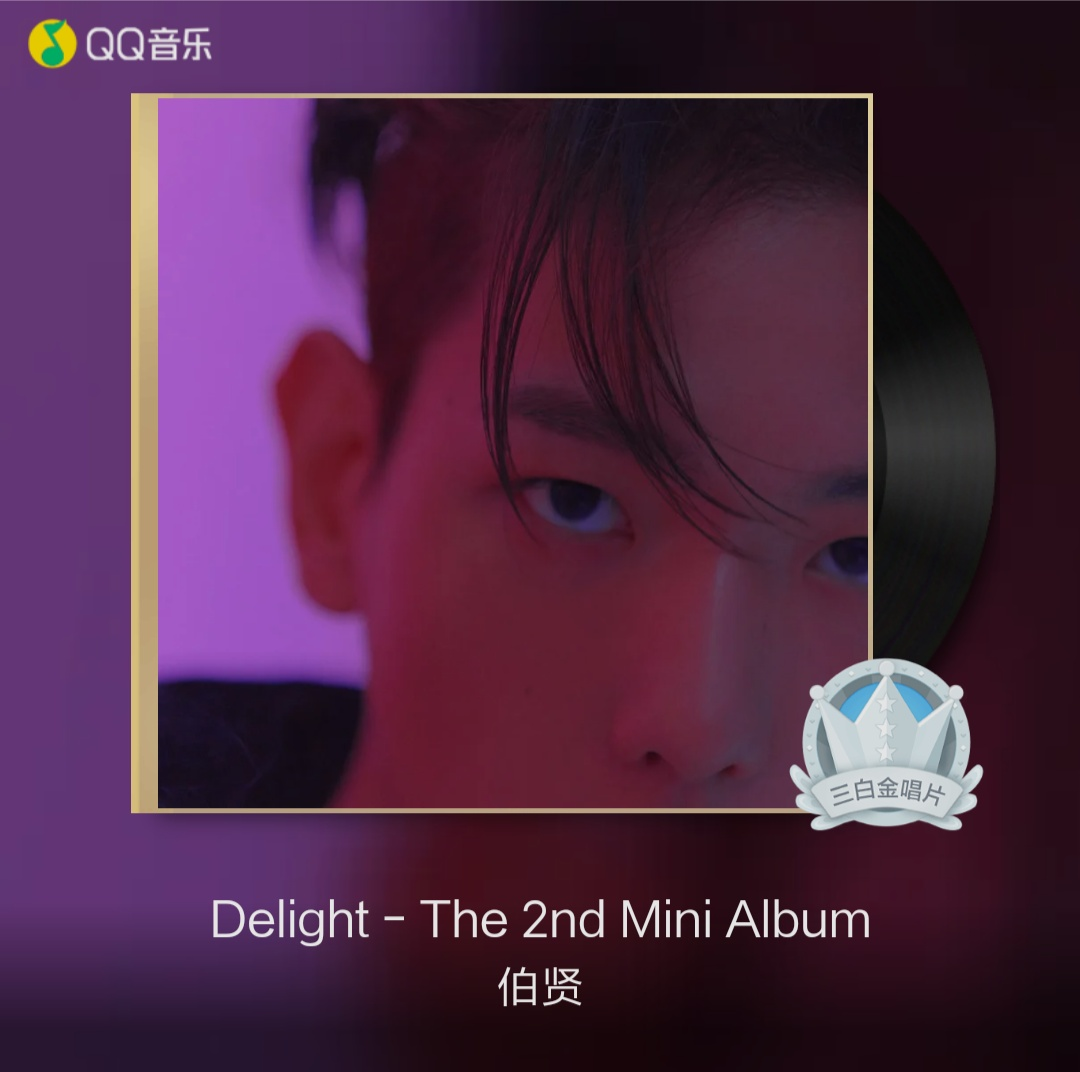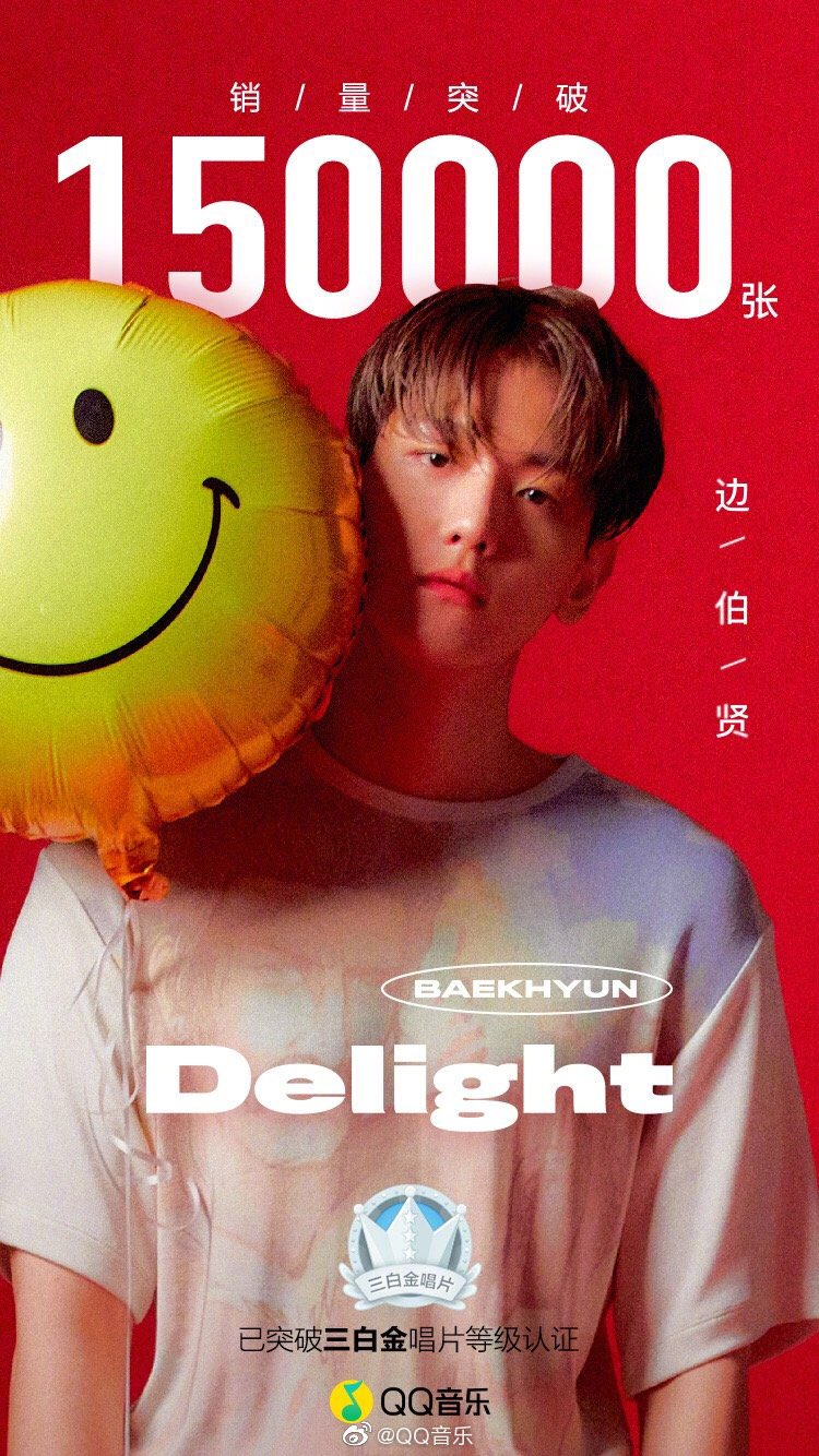 Theo đó, mini album Delight của Baekhyun đạt Triple Platinum trên QQ Music khiến fan vô cùng vui mừng và thích thú. QQ Music là một trang âm nhạc hàng đầu của Trung Quốc, muốn biết độ phổ biến của bài hát tại thị trường đông dân này thì thành tích trên trang âm nhạc này là điều nhất định phải xem qua. Điển hình là Baekhyun, album Delight mang đến sức hấp dẫn nhất định đối với khán giả Trung Quốc và hiện đã bán ra 150.000 bản trên QQ Music (Album kỹ thuật số). Album này được Baekhyun phát hành vào ngày 25 tháng 5, có nghĩa anh chàng mất chưa đến 1 tuần để đạt con số tẩu tán đó và đạt Triple Platinum trên trang QQ Music.