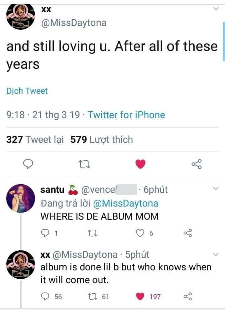 “Nhớ thì đợi tiếp đi chứ album chị xong rồi đó nhưng mà không biết bao giờ được lên kệ nghen hihi”