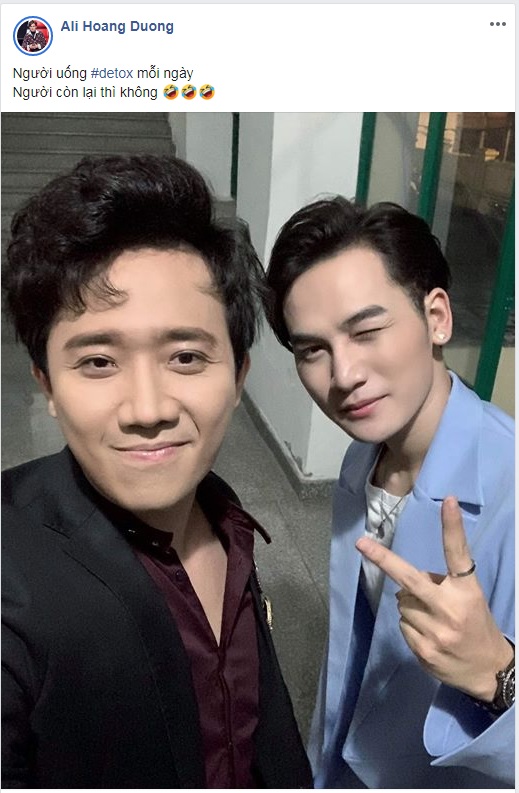 Cụ thể, khi đăng tải hình chụp chung cùng nam MC, Ali Hoàng Dương chia sẻ: “Người uống #detox mỗi ngày. Người còn lại thì không”. Dòng trạng thái đã thu hút hàng nghìn lượt thích từ cộng đồng mạng vì sự “nhây” của giọng ca Xinh lung linh.