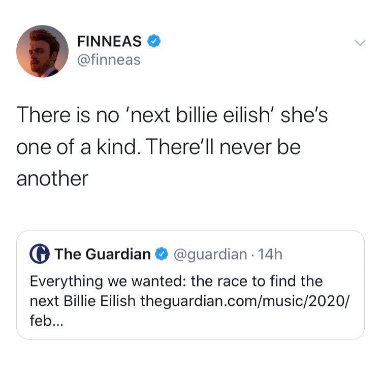 “Ngành công nghiệp âm nhạc luôn tìm cách để lấp đầy chỗ trống, vì vậy khi có ai đó thành công, nó luôn muốn tạo ra một bản sao y hệt. Đó chính là lý do vì sao chúng ta có những ngôi sao ủ rũ - đi theo khuôn mẫu của Ed Sheeran và Lewis Capaldi - những người thiếu một yếu tố gì đó nhưng được thêm chỉ để trở thành những công cụ sinh lời trong dòng nhạc sướt mướt. Tương tự như vậy, công cuộc tìm kiếm cho 'những Billie Eilish mới' chắc chắn đã được bắt đầu.”