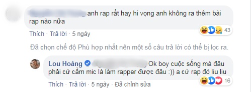 Tuy nhiên, bên cạnh những dòng bình luận của fan dành tình cảm cho Lou Hoàng thì cũng có ý kiến không tích cực dành cho anh. Theo đó, một tài khoản đã bình luận rằng: “Mong anh không rap thêm ca khúc nào nữa”. Đáp lại ý kiến này, Lou Hoàng thẳng thắn một cách khá “gắt”: “Cuộc sống mà đâu phải cứ cầm mic là làm rapper được đâu. Anh cứ rap đó”. Lời đáp trả mạnh mẽ này cho thấy Lou Hoàng vô cùng bản lĩnh đối mặt với những bình luận không hay của anti fan.