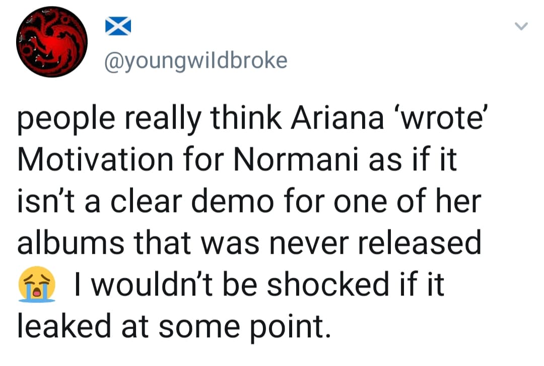 Hôm qua, nữ ca sĩ Normani đã cho ra mắt ca khúc mới của mình mang tên Motivation, một bản Rnb bắt tai có sự góp sức của Ariana Grande. Tất nhiên, sẽ không có gì đáng nói nếu như mới đây, không có ý kiến cho rằng ca khúc Motivation giống như một bản demo bị bỏ quên của Ariana Grande dành cho Normani: “Mọi người đã thật sự nghĩ rằng Ariana Grande đã “viết” nên Motivation cho Normani sao? Nó như thể là bản demo cho một album nào đó của Ariana Grande mà cô ấy chưa bao giờ công bố trước đó, tôi sẽ không bị sốc vì điều đó đâu”. Người khán giả này cho rằng Motivation nghe chả khác gì những ca khúc trước đây dành riêng cho phong cách và giọng hát của Ariana Grande chứ nó không hề là một sản phẩm thuộc về Nomarni.