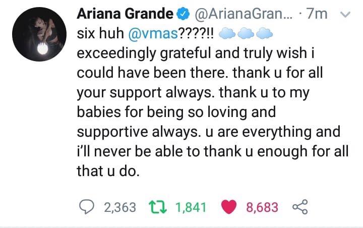 Ngay khi lễ trao giải MTV VMAs 2019 vừa kết thúc, Ariana Grande đã đăng một dòng tweet chia sẻ niềm hạnh phúc và sự bất ngờ khi nhận được nhiều giải thưởng đến vậy: “6 giải VMAs luôn à???!! Tôi biết ơn rất nhiều và thực sự ước rằng mình có thể ở đấy. Cảm ơn tất cả những người đã luôn ủng hộ tôi. Cảm ơn các bạn fan đags yêu đã luôn yêu thương và cổ vũ cho tôi. Các bạn là tất cả và tôi sẽ không bao giờ có thể gửi lời cảm ơn đủ so với những gì các bạn đã làm cho tôi.”