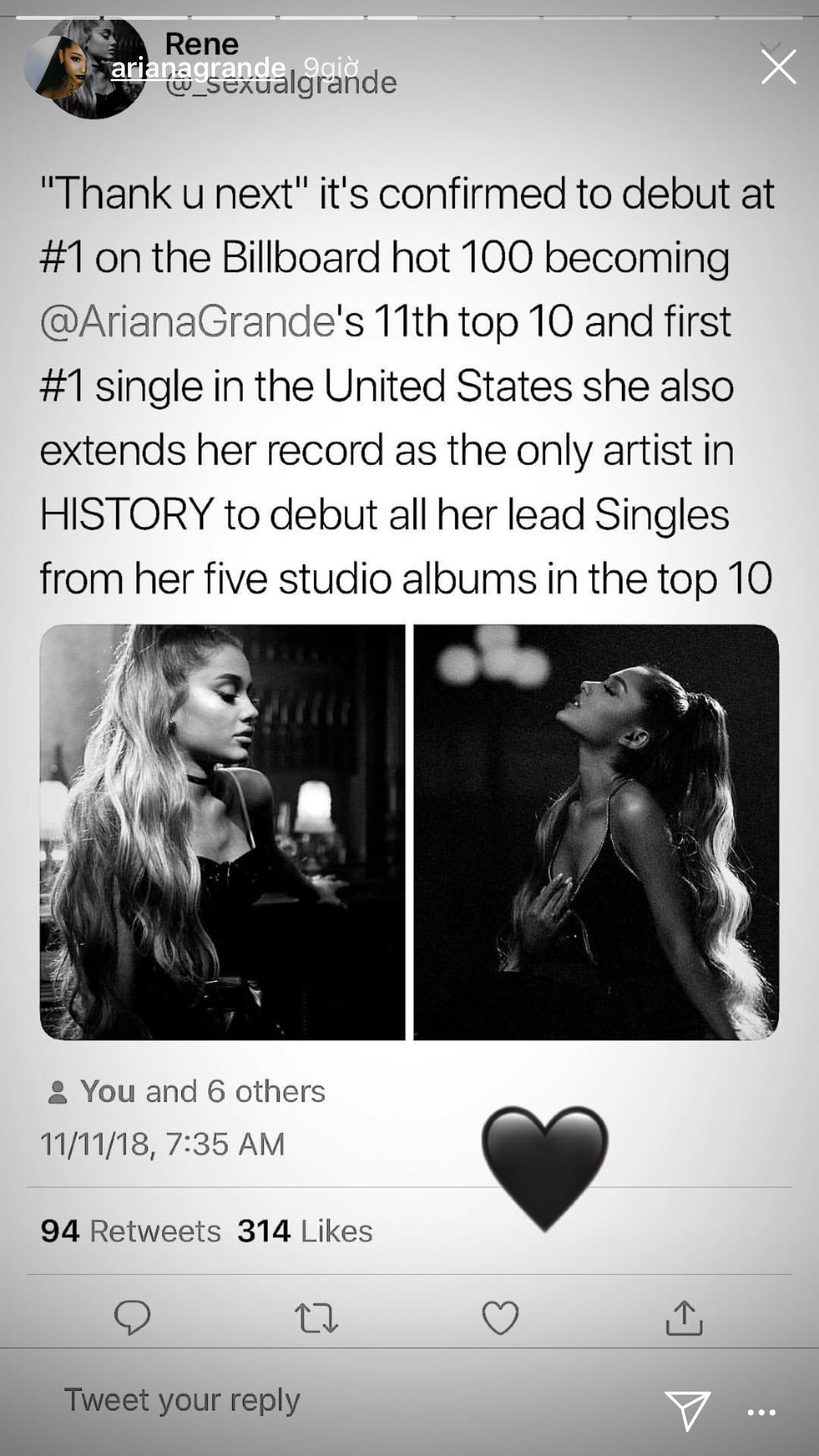 Tin chính thức xác nhận từ cô nàng Ariana Grande nhà ta rằng: Thank you, next sẽ là ca khúc đầu tiên leo lên #1 của Ariana Grande. Đây có thể xem như thành tích khủng khi Ariana Grande đã leo lên hẳn vị trí này ngay tuần đầu tiên phát hành, đặc biệt là trong thời đại hoàng kim của làng rap hiện nay, 1 ca khúc pop làm được điều đó thì không tầm thường chút nào đâu nhé!