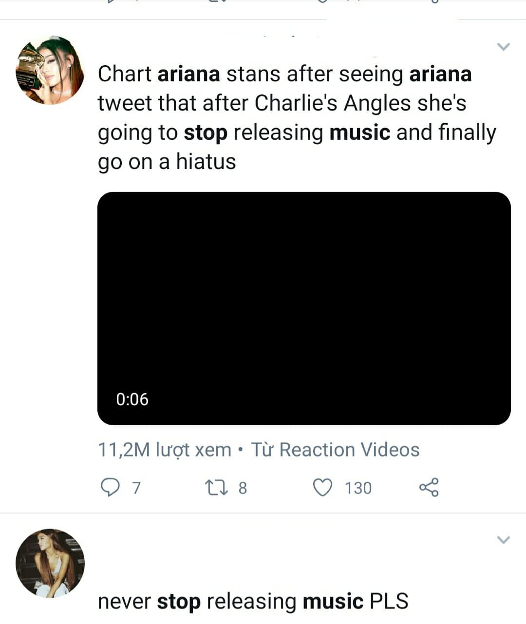 Mặc dù tuyên bố sẽ tạm ngừng ra nhạc sau khi hoàn thành dự án OST Charlie's Angels, nhưng người hâm mộ của Ariana Grande cũng không cần quá lo lắng. Vì biết đâu từ bây giờ cho đến thời điểm đó, Ariana Grande sẽ “đánh úp” fan bằng thật nhiều những ca khúc mới thì sao, không gì là không thể đối với cô nàng tài năng này cả.