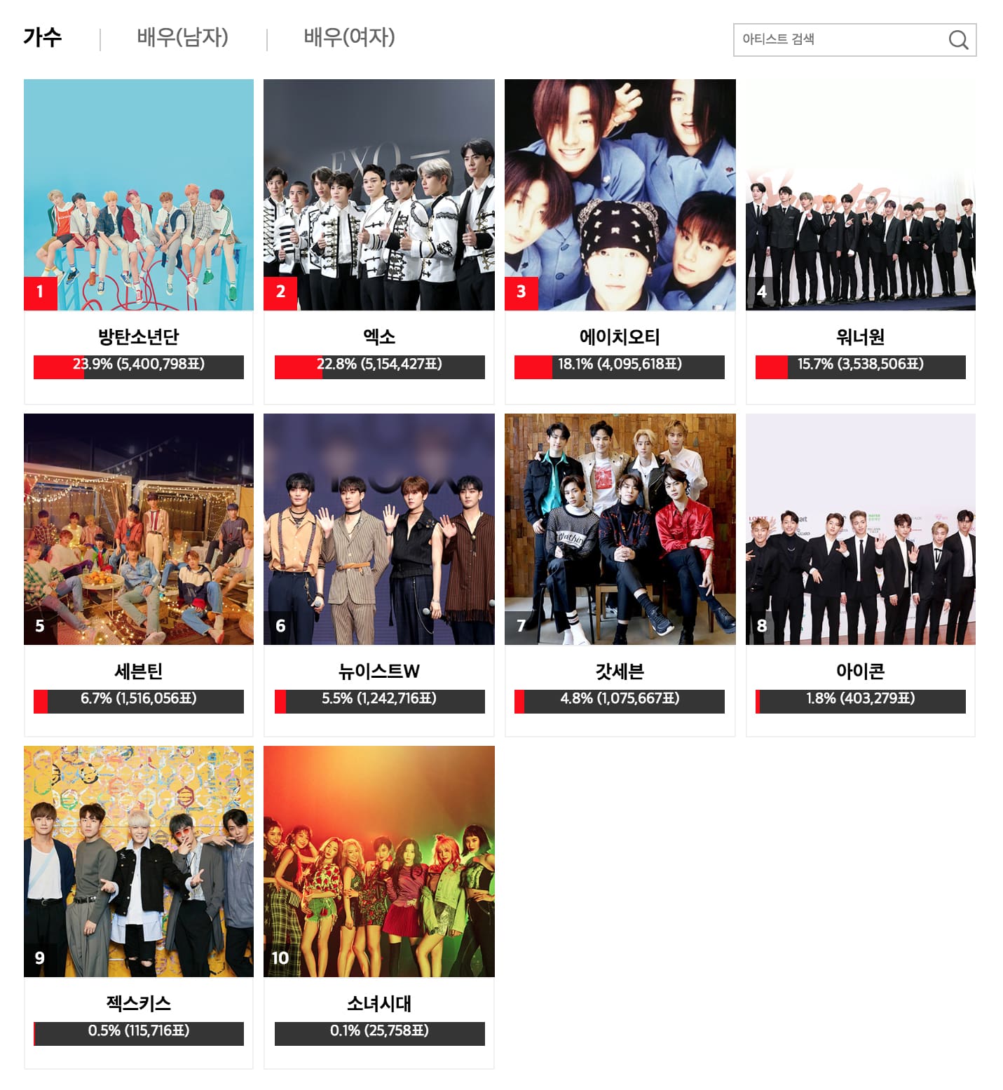 Cụ thể hơn, ở hạng mục nghệ sĩ xuất sắc nhất, BTS đã nhanh chóng giành vị trí dẫn đầu với 23,9% (5,400,798 lượt vote), vượt qua nhóm nhạc nam đến từ SM - EXO (22,8%). Ở hạng mục nam diễn viên phổ biến nhất, thành viên của EXO - Sehun đã giành vị trí dẫn đầu với 33,5% (543,068 lượt vote). Hạng mục cuối cùng - Nữ diễn viên phổ biến nhất, IU đã vượt qua Yoona để giành được vị trí đứng đầu với 52,6% (1,347,767 lượt vote).