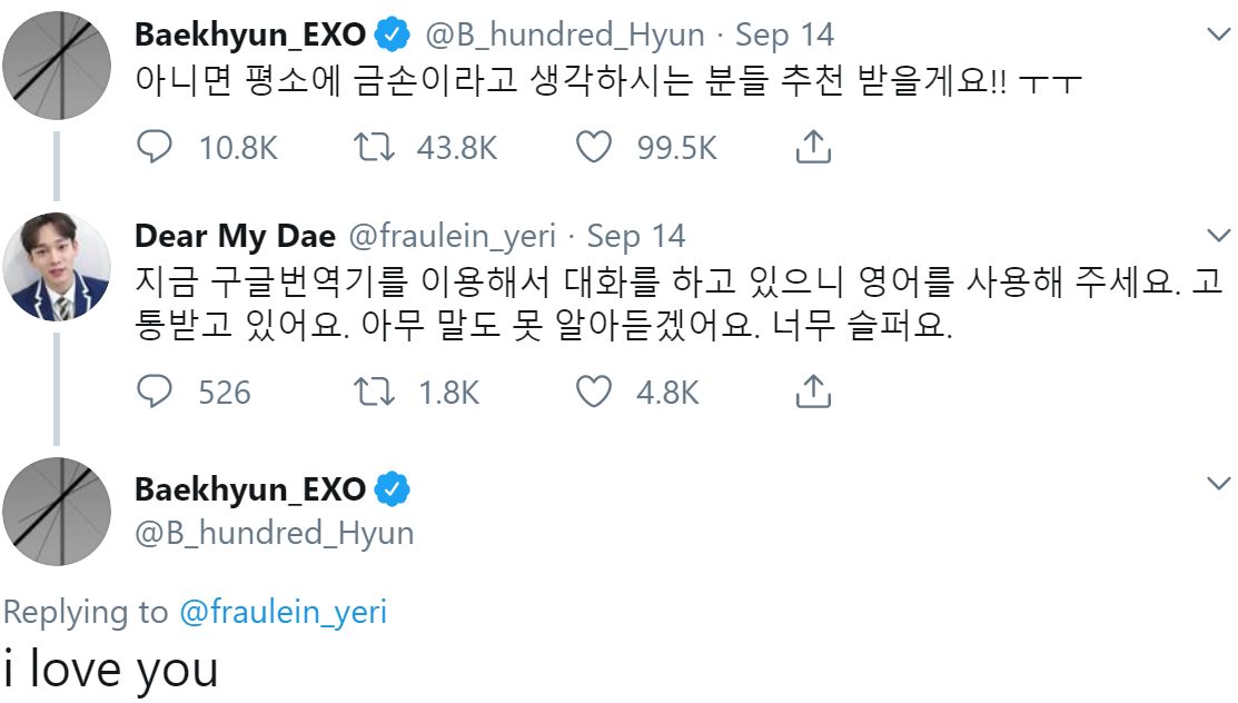 Ngày 14/9, Baekhyun (EXO) đã online trên Twitter và có hàng loạt tương tác với EXO-Ls qua những đoạn tweet và reply. Tuy nhiên, anh chàng đã sử dụng toàn bộ bằng tiếng Hàn và điều này đã khiến các fan quốc tế gặp khó khăn khi muốn trò chuyện cùng thần tượng. Vậy nên, họ đã cố gắng sử dụng nhiều cách để có thể được tương tác cùng nam idol, thậm chí là “năn nỉ” anh sử dụng tiếng Anh nhiều hơn.