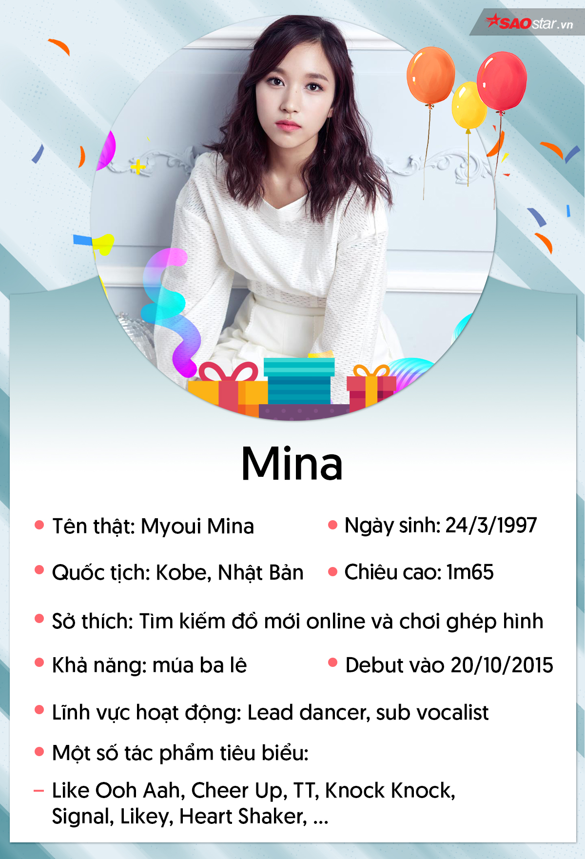 Nữ thần tượng xuất sắc vượt qua nhiều thực tập sinh khác để lọt vào đội hình debut chính thức của TWICE. Bên cạnh đó, cô luôn nằm trong top những thành viên được bình chọn cao nhất trên mạng nhờ gương mặt quyến rũ, cuốn hút và giọng hát trầm ấn tượng. Nếu bạn cũng đã lỡ “phải lòng” Mina thì hôm nay (24/3) nhân ngày sinh nhật cô ấy, hãy cùng nhau ghi nhớ những điều dễ thương về nàng “Thiên nga đen” này nhé!