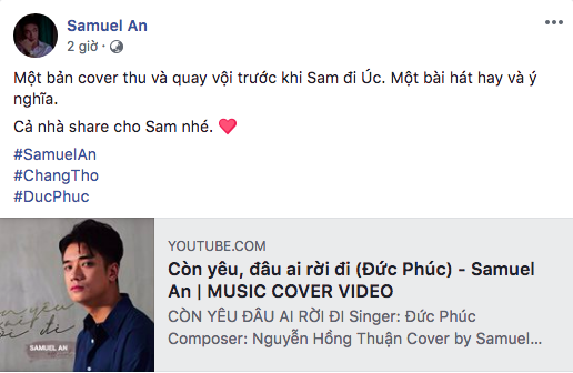 Mới đây, trên trang cá nhân của Samuel An vừa đăng tải đoạn clip anh chàng cover ca khúc Còn yêu đâu ai rời đi. Chàng thơ của Noo Phước Thịnh chia sẻ đây là một bản thu được quay vội trước khi sang Úc. Có lẽ, ca khúc này như là một món quà nhỏ của Samuel An để ngầm “gieo” thương nhớ cho khán giả trước khi anh chàng rời khỏi Việt Nam.