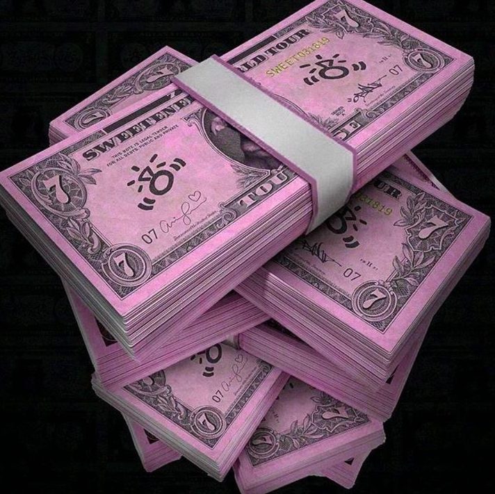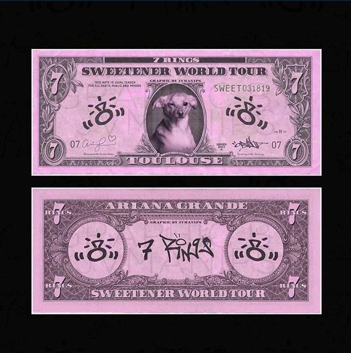 Bên cạnh đó, trong lúc màn biểu diễn 7 Rings diễn ra, khán giả được Ariana Grande ném hàng trăm tờ tiền (tất nhiên là tờ tiền không sử dụng được). Thay vì với các hoa văn và họa tiết của tờ USD thông thường, tờ tiền này được trang trí với hình ảnh chú cún cưng của Ariana. Bên cạnh đó, thay vì là mệnh giá của tờ tiền giấy, Ariana đã cho thay thế bằng dòng chữ 7 Rings.