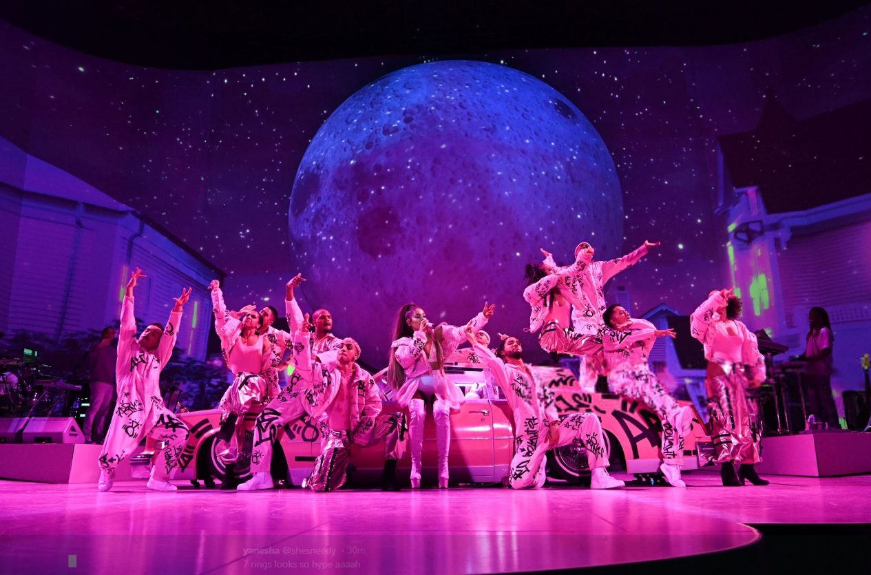 Dàn vũ công cũng khoác lên mình chiếc áo 7 Rings và phụ họa nhiệt tình với bản hit.