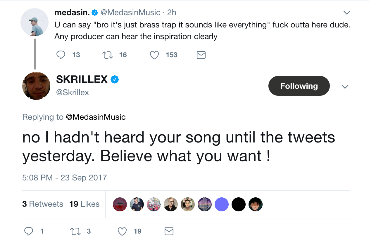 Skrillex phản bác lại việc ca khúc của anh đạo Territory của Medasin trên Twitter.