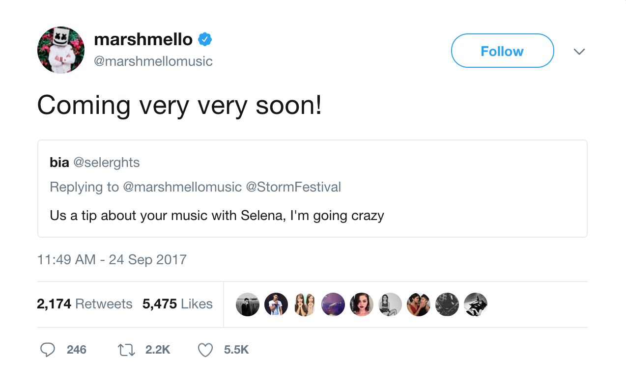 Marshmello xác nhận trên Twitter về sản phẩm âm nhạc giữa anh và Selena Gomez.