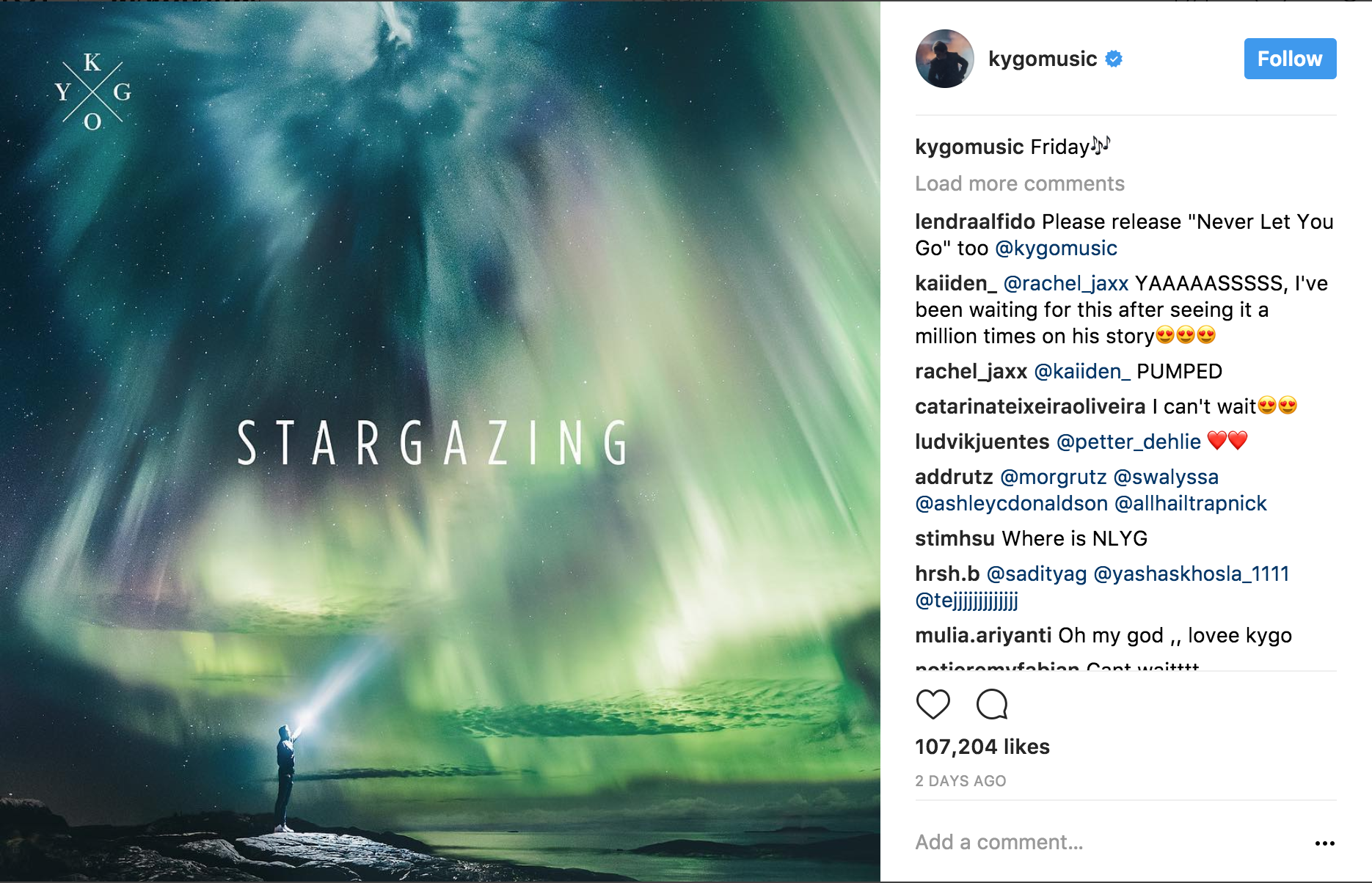 Một tài năng khác của âm nhạc điện tử thế giới là Kygo cũng chuẩn bị cho lên sóng ca khúc mới. Với tên gọi Stargazing, sản phẩm này sẽ chính thức được ra mắt vào thứ 6 (22/9) này. Trong đó, ông hoàng của Tropical House đã đem track này ra chơi tại rất nhiều festival. Và dĩ nhiên, nó đã nhận được những phản hồi tích cực của người hâm mộ. Cùng nghe thử và cho chúng tôi biết cảm nghĩ của bạn về Stargazing nhé: