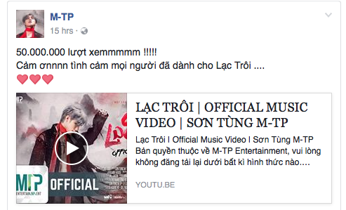 Vừa mới đây, sau hơn 2 tuần ra mắt, Sơn Tùng đã ăn mừng cột mốc 50 triệu lượt xem dành cho sản phẩm độc lập đầu tay mang tên Lạc trôi, đây là minh chứng cho sức hút của ca khúc chưa hề có dấu hiệu giảm nhiệt.