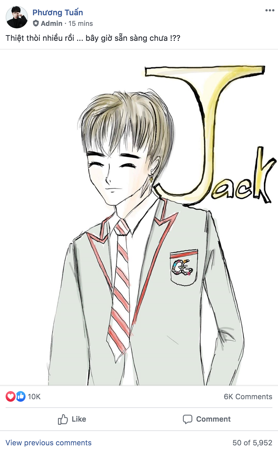 Mới đây, Jack khiến người hâm mộ phấn khích cực độ bằng một bài viết ngầm thông báo ngày trở lại đường đua Vpop đã sắp cận kề. Cụ thể, anh chàng đăng tải một bài viết vào nhóm kín của FC đang có hơn 200.000 người tham gia, trong đó là bức ảnh vẽ tay hình ảnh mặc đồng phục đi học từng được đăng tải trước đó, cùng dòng chú thích: “Thiệt thòi nhiều rồi… bây giờ sẵn sàng chưa?”. Ngay lập tức, hàng nghìn bình luận từ bốn phương tám hướng đổ vào, tất cả đều hừng hực khí thế “sẵn sàng” cùng thật tượng, sức mạnh của cộng đồng Đom đóm đông đảo lúc này đây được thể hiện mạnh mẽ.