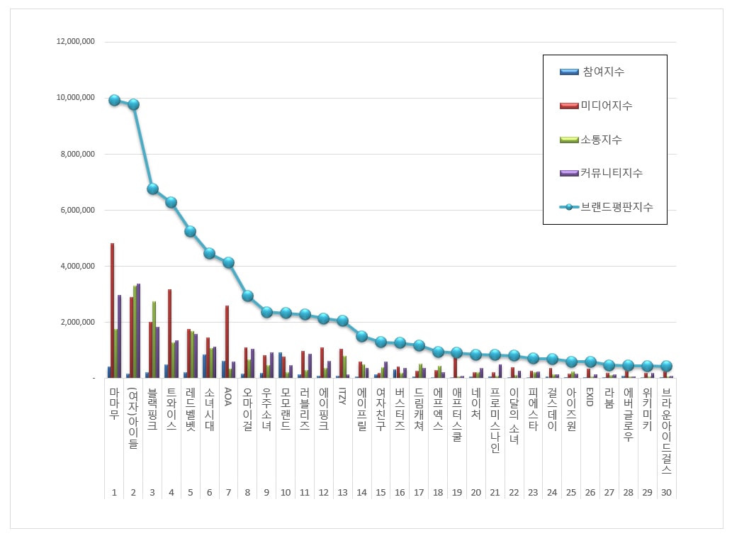 Trong tháng 12, Mamamoo đã vươn lên dẫn đầu BXH danh tiếng với mức tăng trưởng ấn tượng so với tháng trước - 67,60%. Nhóm nhạc nữ 4 thành viên đạt tổng chỉ số là 9,928,929 điểm.
