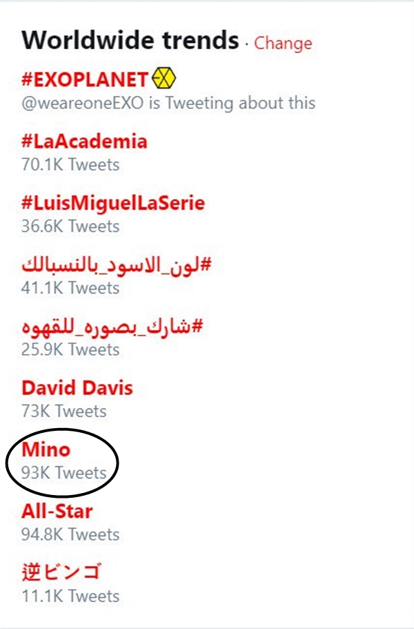 Từ khoá Mino lọt top trend thế giới trên Twitter với 93 nghìn lượt tweet.