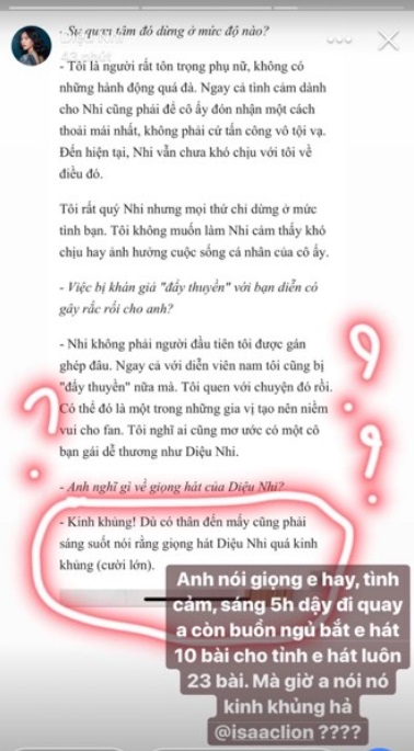 Ấy thế nhưng mới đây, trong một bài trả lời phỏng vấn, khi được hỏi chia sẻ cảm nghĩ về giọng hát của Diệu Nhi, Isaac thẳng thừng tuyên bố… “Kinh khủng”. Ngay lập tức, Diệu Nhi đã đăng tải trên story của mình kèm dòng tin nhắn “bóc phốt” mang tính khá “dằn mặt”: “Anh nói giọng em hay, tình cảm, sáng 5 giờ dậy đi quay anh buồn ngủ bắt em hát 10 bài cho tỉnh, em hát luôn 23 bài. Mà giờ anh nói kinh khủng hả Isaac?”. Lời chia sẻ mới nhất này từ Diệu Nhi khiến cho cộng đồng fan của cả hai được một phen “vỡ bụng” vì tình huống trớ trêu.
