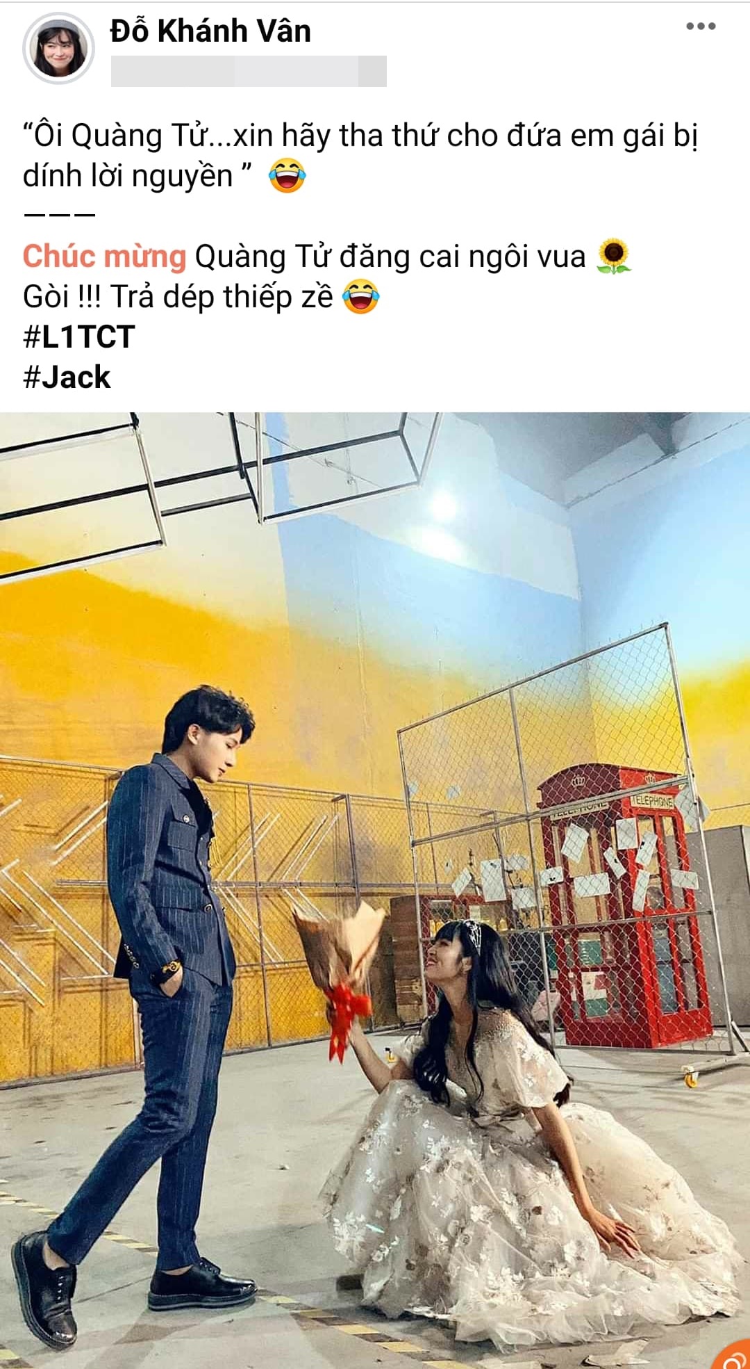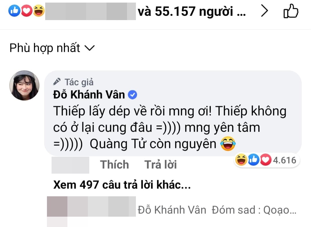 Đáp lại sự “ghen tuông” này, Khánh Vân để lại một bình luận: “Thiếp lấy dép về rồi mọi người ơi. Thiếp không có ở lại cung đâu. Mọi người yên tâm. Hoàng tử còn nguyên“. Chính câu trả lời đáng yêu từ Khánh Vân đã một lần nữa khiến cho khán giả bị “đổ gục” vì cách ứng xử nhẹ nhàng nhưng không kém phần khéo léo. Có lẽ sau bình luận này, người hâm mộ của Jack đã có thể yên tâm rằng thần tượng sẽ không bị cô nàng “Mắt biếc” này cướp đi mất rồi nhé!