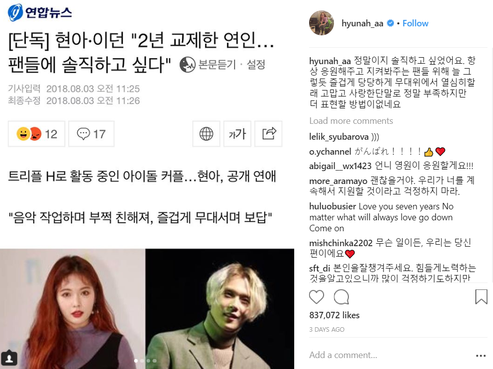 Dòng trạng thái của HyunA trên tài khoản Instagram cá nhân: “Mình thật sự muốn thẳng thắn, cảm ơn các bạn đã luôn theo dõi mình, mình muốn đứng trên sân khấu với sự tự hào. Cảm ơn các bạn“.